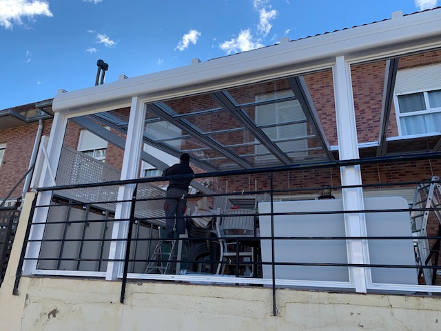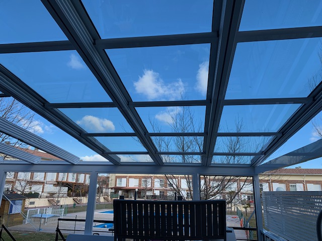 Techo móvil con hojas deslizantes, opción de cristal monolítico o de cámara con protección solar y bajo emisivo en dichos vidrios. Otras opciones disponibles para este sistema son el policarbonato o ciego en panel sándwich, con diferentes colores y acabados en la perfilería. Sistema de apertura motorizada o manual, esta última solo se aplica en los paneles o policarbonatos de poco peso. Posibilidad de toldos por el exterior. Opción de canal recoge aguas frontal y bajantes.